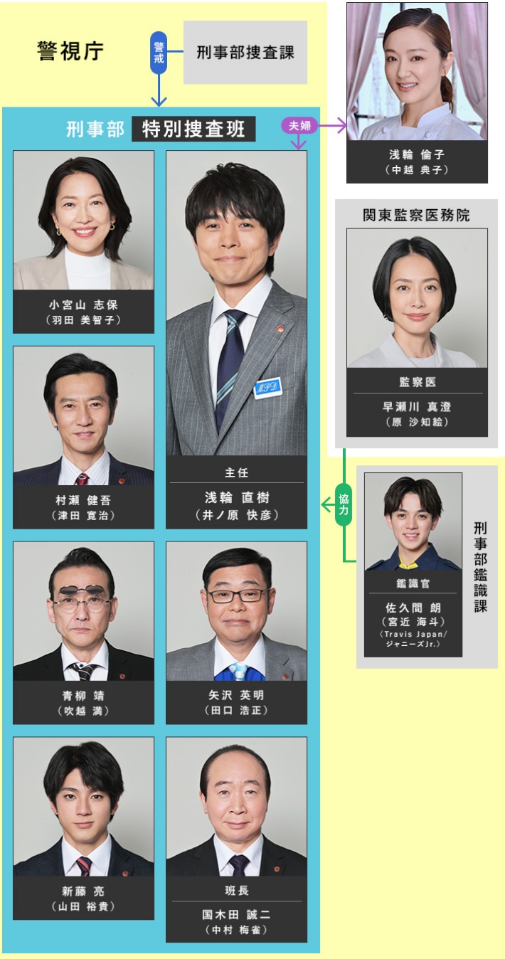 | 浅輪直樹(あさわ・なおき)………井ノ原快彦 이노하라 요시히코 경시청 수사1과 특별수사반 주임입니다.경감입니다. 정의감이 남달리 강하고, 구부러진것을 매우 싫어하는 성격입니다. 항상 약자에 들러붙어, 공훈과는 거리가 먼 충실한 수사도 마다하지 않습니다. 小宮山志保(こみやま・しほ)………羽田美智子 하다 미치코 경시청 수사1과 특별수사반 형사입니다. 경부보. 특수반 멤버와의 사이에는 강한 유대감을 느끼고 있습니다. 특히 무라세에게 도움을 받은 은혜이기 때문에 그에 대한 마음은 강합니다. 마을의 여울을 걱정하면서 의지하고 있습니다. 村瀬健吾(むらせ・けんご)………津田寛治 츠다 칸지 경시청 수사1과 특별수사반 형사입니다. 경부보. 자신의 능력은 커리어 이상이라고 믿어 의심치 않는 자신가. 시호와는 사랑을 의식했던 시기도 있고, 그녀의 활약을 뒤에서 지탱하는 것을 기뻐하고 있는 것도. 青柳靖(あおやぎ・やすし)………吹越満 후키코시 미쓰루 경시청 수사1과 특별수사반 형사입니다. 경감님. 반골정신의 덩어리같은 남자로, 자산가와 상류계급을 매우 싫어하는 비아냥쟁이입니다. 矢沢英明(やざわ・ひであき)………田口浩正 타구치 히로마사 경시청 수사1과 특별수사반 형사입니다. 너그러운 마음으로 괴짜 아오야기를 받아 들여 듣는 역할이나 샌드백으로 일관할 수도 있는 한편, 때로는 엄하게 꾸짖을 수도 있습니다. 新藤亮(しんどう・りょう)………山田裕貴 야마다 유키 경시청 수사1과 특별수사반 형사입니다. 순경. 운동신경이 좋고, 범인과 격투하는 장면 등에서는 매우 믿음직합니다. 뜨거운 마음을 간직하고 있지만 현대적인 효율주의적인 사고를 겸비합니다. 佐久間朗(さくま・あきら)………宮近海斗〈Travis Japan/ジャニーズJr.〉 미야치카 카이토 경시청 본청 소속의 젊은 감식과원입니다. 감식의 대선배 이가리 테쓰지 밑에서 수업중입니다. 浅輪倫子(あさわ・みちこ)………中越典子 나카고시 노리코 나오키의 아내. 일찌기 9계의 계장이었던 카노 린타로의 친딸이며, "파티시에르"입니다. 早瀬川真澄(はやせがわ・ますみ)………原沙知絵 하라 사치에 관동감찰 의무원에 근무하는 감찰의사입니다. 시호와는 여전히 사이가 좋습니다. 国木田誠二(くにきだ・せいじ)………中村梅雀 나카무라 바이쟈쿠 경시청 수사1과 특별수사반의 반장입니다. 경시청 수사 1과 6계 시절에 원죄를 일으킨 과거를 재평가해, 특수반의 반장이 됩니다. |