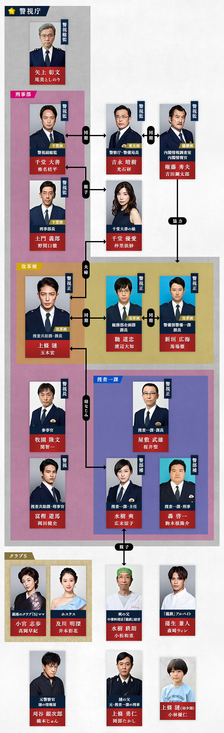 수사 공조과·과장입니다.야심가로, 마침내 경찰 톱인 경시 총감이 되는 것을 목표로 하고 있습니다.프로파일링 능력이 뛰어나고 상대의 성격과 내면을 읽는 데 능숙합니다. 좀처럼 웃지 않고 상사에게 상냥하지 않지만 이용가치가 높아서 편리합니다.아버지·유우진은 전 경찰관입니다. 동기와 신파벌 「개혁파」를 일으켜, 아버지를 자살로 몰아넣은 진범으로, 의붓아버지이기도 한 부총감·센도에게 복수를 기도합니다만…!?
