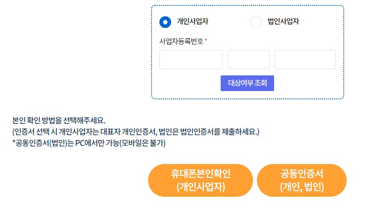 개인사업자인 경우 휴대폰 또는 공동인증서로 본인확인을 진행합니다.