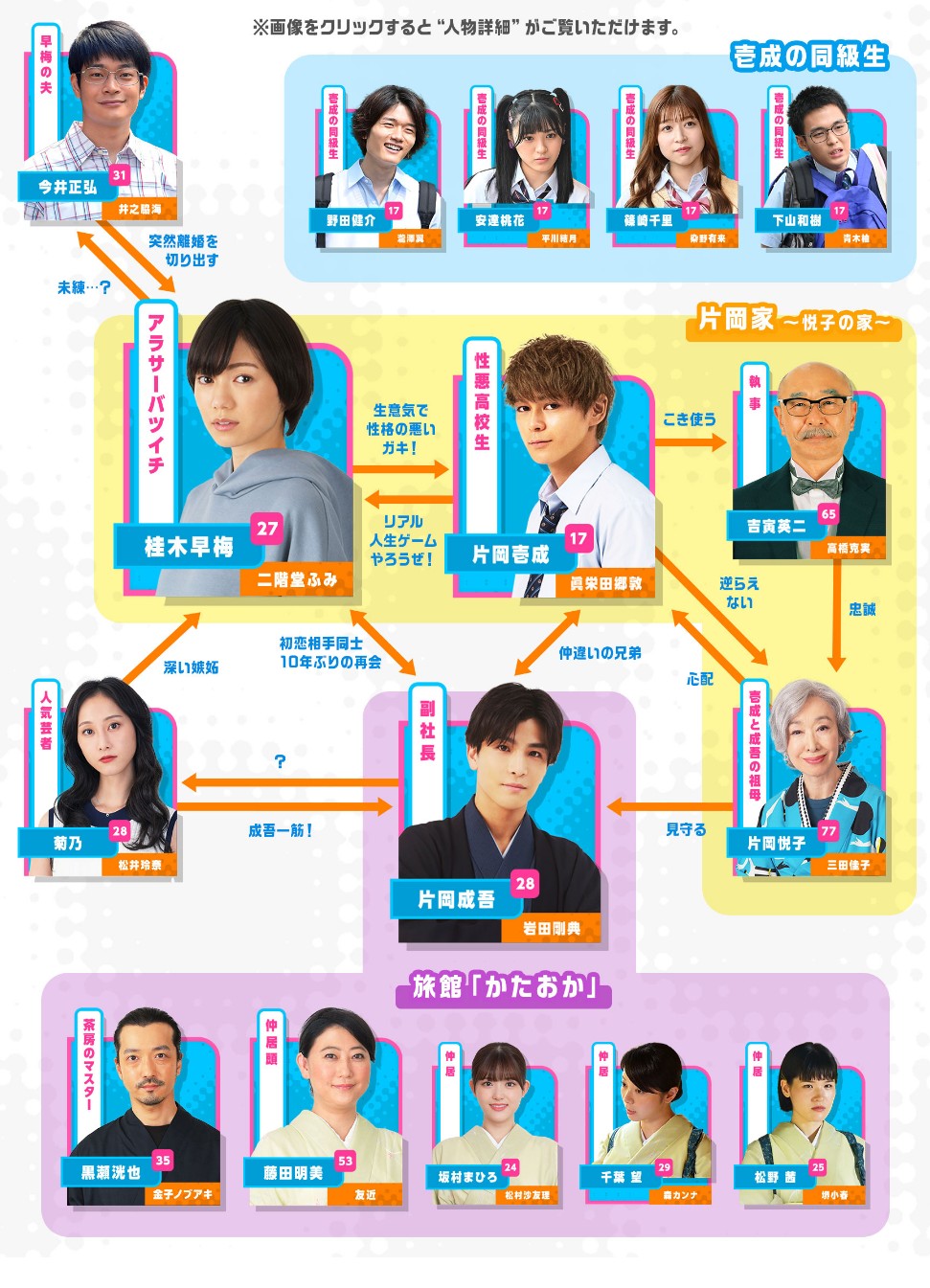 | 桂木早梅 역 … 二階堂ふみ 니카이도 후미 片岡壱成 역 … 眞栄田郷敦 마에다 고돈 菊乃 역 … 松井玲奈 마츠이 레나 今井正弘 역 … 井之脇 海 이노와키 카이 坂村まひろ 역 … 松村沙友理 마츠무라 사유리 松野茜 역 … 堺小春 사카이 코하루 吉寅英二 역 … 高橋克実 타카하시 카츠미 藤田明美 역 … 友近 토모치카 千葉望 역 … 森カンナ 모리야 칸나 黒瀬洸也 역 … 金子ノブアキ 카네코 노부아키 片岡悦子 역 … 三田佳子(특별출연)미타 요시코 片岡成吾 역 … 岩田剛典 이와타 타카노리 |