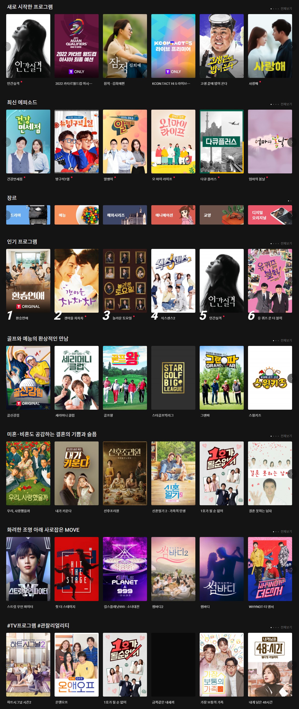 환승연애, 놀라운 토요일, 식스센스2, 인간실격, 유 퀴즈 온 더 블럭, 스트릿 우먼 파이터, 아는 형님, 대탈출4, 슬기로운 의사생활 시즌2, 방구석1열, 걸스플래닛999 : 소녀대전, 내가 키운다, 골신강림, 잠적 - 김희애편, 유미의 세포들, 뭉쳐야 찬다2, 해방타운, 금쪽같은 내새끼, 더 로드: 1의 비극, 세리머니 클럽, 골프왕, 스타골프빅리그, 그랜파, 스윙키즈, 버디버디, 신서유기 스페셜 스프링 캠프, 랄라랜드, 신서유기 외전 강식당, 섬총사, 태어나서 처음으로, 토크몬, 위플레이, 우리, 사랑했을까, 산후조리원, 신혼일기 2 - 가족의 탄생, 1호가 될 순 없어, 결혼 못하는 남자, 가족의 형태, 이번 주 아내가 바람을 핍니다, 이번 생은 처음이라, 연애 말고 결혼, 저 결혼 못 하는게 아니라, 안 하는 겁니다, 우리가 결혼할 수 있을까, [무삭제판] 부부의 세계, 별거가 별거냐, 우리 이혼했어요, 아내의 맛, 40살 여자와 90일 안에 결혼하는 방법, 내하BOSS요취아2 : 보스와의 계약결혼 2, [무삭제판] 애로부부, 경로를 이탈하였습니다, 힛 더 스테이지, 썸바디2, 썸바디, WHYNOT-더 댄서, 킹덤 : 레전더리 워, 로드 투 킹덤, GOOD GIRL : 누가 방송국을 털었나, 언프리티 랩스타, 댄싱9, 댄싱9 시즌2, 댄싱9 시즌3, 하트시그널 시즌2, 온앤오프, 가장 보통의 가족, 내게 남은 48시간, 일로 만난 사이, 둥지탈출, 신입사원 탄생기 - 굿피플, 서울메이트, 어서와~ 한국은 처음이지?, 내 친구의 집은 어디인가, 비밀언니, 나의 첫 사회생활, 이방인, 숲속의 작은 집, 커피프렌즈, 윤식당, 노는 언니, 나는 살아있다, 신비한 무술사전, 시켜서 한다 오늘부터 운동뚱, 달리는 사이, 경이로운 소문, 시지프스, 아이리스 2 : 뉴제너레이션, 아테나 : 전쟁의 여신, 유로파 컨퍼런스리그 플레이오프, 분데스리가, 마녀식당으로 오세요, 백종원의 사계, 스파이시티, EURO 2020, 여고추리반, 아이돌 받아쓰기 대회, 유명가수전 히든트랙, 마우스: 더 프레데터, 언더커버, 배드 지니어스 더 시리즈, 사사양아우견니, 고호의 별이 빛나는 밤에, THE K2, 사생활, 런 온, 38 사기동대, 본 대로 말하라, 연애조작단; 시라노, 알 수도 있는 사람, 효리네 민박2, 안녕 드라큘라, 혼자 살아보니 어때?, THE 태티서, 채널 소시, 스타일 라이브 : 일상의 탱구캠, 유령을 잡아라, 보좌관 – 세상을 움직이는 사람들, 제3의 매력, 스타트업, 내일 그대와, 백일의 낭군님, 슬기로운 감빵생활, 보이스 2, 신의 퀴즈 : 리부트, 으라차차 와이키키 2, 갯마을 차차차, 대탈출 3, 자백, 솔로몬의 위증, 크리미널마인드, 마우스, 괴물, 더 지니어스: 그랜드 파이널, 더 지니어스: 룰 브레이커, 더 지니어스: 게임의 법칙, 모두의 거짓말, 19미스티, 미스티, 놀라운 토요일 1부 - 호구들의 감빵생활, 아름다운 나의신부, [무삭제판] 우아한 친구들, 미스터 기간제, 크라임씬 3, 크라임씬 2, 손세이셔널-그를 만든 시간, 으라차차 산골 축구단, 골든일레븐, 캡틴 츠바사, 축구의 신, 드론축구 - 하늘위의 스트라이커, 축구대장 곽지혁, 굿와이프, 그냥 사랑하는 사이, 명탐정 코난 12기 (더빙), 일파청 : 푸르렀던 그 날, 와이 우먼 킬, 낮과밤, 롱 베케이션, 번외수사, 마이 매드 팻 다이어리, 독립만세, 보석의 나라, 별상타요아학습: 공부 말고 열아홉, 특수사건 전담반 TEN, WATCHER (왓쳐), 라이프 온 마스, Show Me The Money 9, 이가인지명, 인현왕후의 남자, 화양연화, 사건기록 그날의 선택, 신화, 흔한남매의 안흔한일기3, 써치, 신비아파트:궁금한이야기S, 너는 나의 봄, 악마판사, 알고있지만, 내딸하자, 백종원의 국민음식, 종극필기, 혼밥인생, 6백만불의 CIX, 월간 집, 보이스4, 애적리미, 미스터리 실험쇼 <다빈치 노트>, 명탐정코난 2021