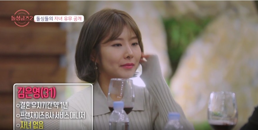 돌싱글즈2 김은영 직업은 프랜차이즈 B사 서비스매니저로 나이는 31세, 이혼 소송등 아직 이혼후 3개월밖에 지나지 않은 상황, 자녀유무???, 남편이 가장으로서 책임을 다하지 못한다는 원망과 결혼에 대한 환상이 이혼의 원인