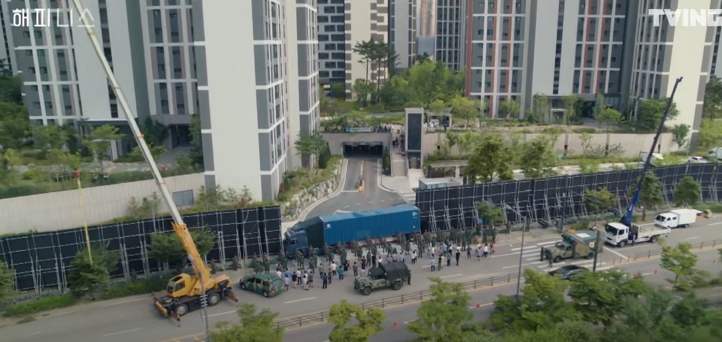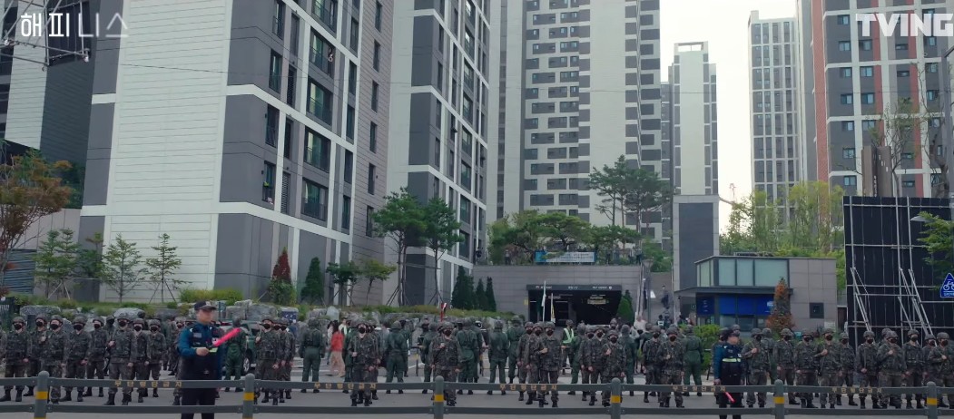 해피니스 드라마에서 광인병 감염자가 발생해 아파트를 봉쇄하는 장면입니다.