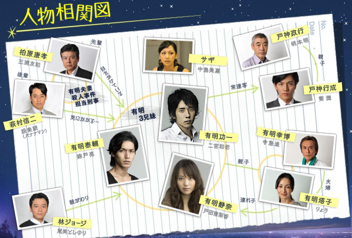 | 有明功一 역 … 二宮和也 니노미야 카즈나리 有明泰輔 역 … 錦戸亮 니시키도 료 有明静奈 역 … 戸田恵梨香 토다 에리카 戸神行成 역 … 要潤 가나메 준 林ジョージ 역 … 尾美としのり 오미 토시노리 萩村信二 역 … 設楽統 (バナナマン) 시타라 오사무 (바나나맨) 高山久伸 역 … 桐谷健太 키리타니 켄타 矢崎秀子 역 … 麻生祐未 아소우 유미 矢崎信郎 역 … 国広富之 쿠니히로 토미유키 |