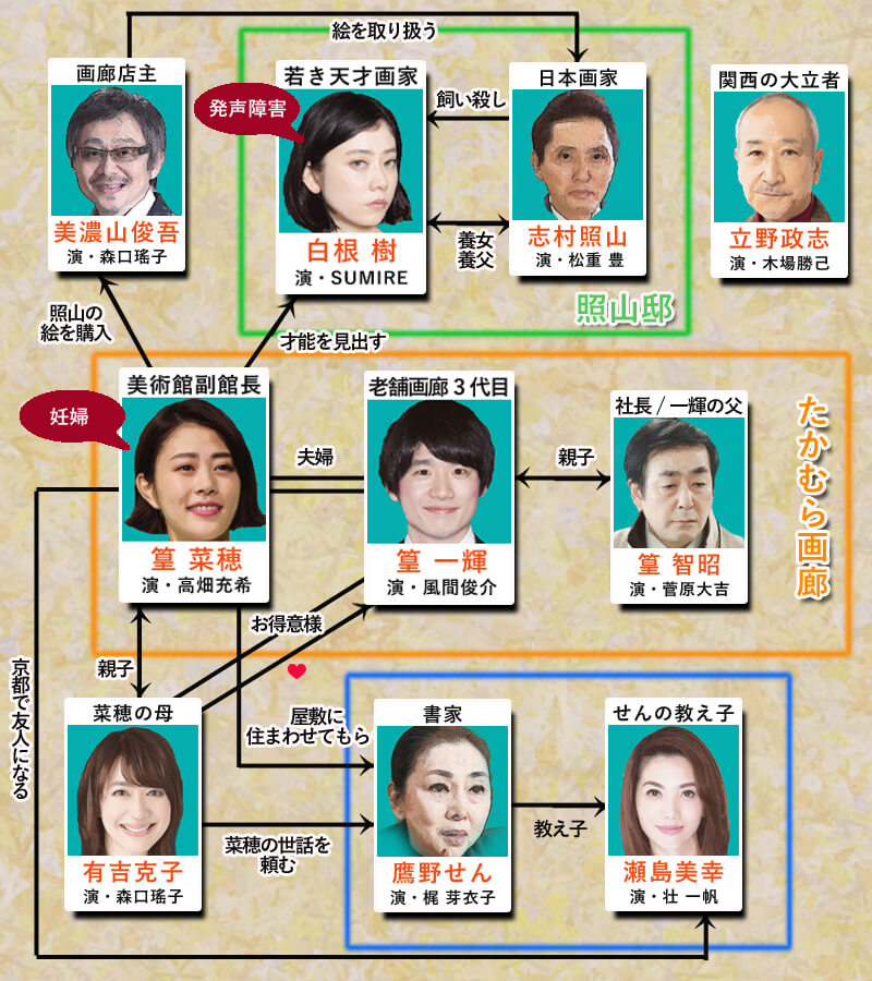 유수한 컬렉션을 자랑하는 미술관의 나호(다카바타 미츠키) 부관장은 전통있는 화랑 3대째인 남편 카제마 슌스케(風間俊介)와의 아이를 가졌으며, 도쿄의 떠들썩한 소란을 피해 교토에 오래 머물렀습니다. 어머니 가쓰코(森口要子)를 만났지만 낯선 땅에서 온 세상은 채소 이삭을 이방인 같은 기분으로 만들었습니다. 그러던 어느 날 들른 미노산(마츠오 타카시)의 화랑에서 한 폭의 무명 화가의 그림에 감동을 받는 나호입니다. 그것은 알려지지 않은 교토화단의 어둠 속에서 그녀를 초대하는 만남이 됩니다.
