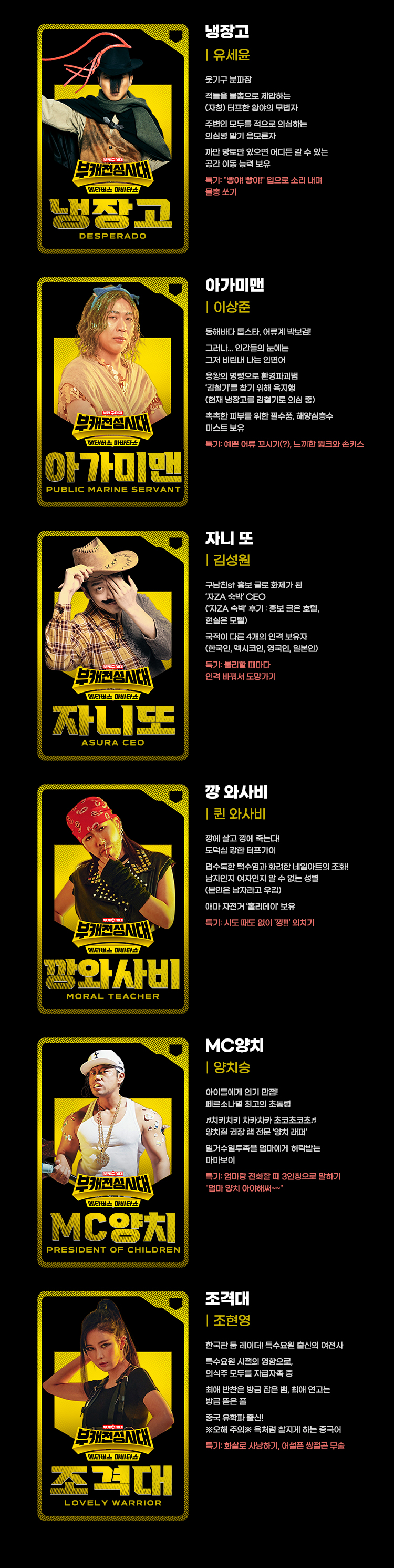 부캐전성시대 출연진 웃기구 냉장고, 아가미맨, 자니 또, 깡 와사비, MC 양치, 조격대