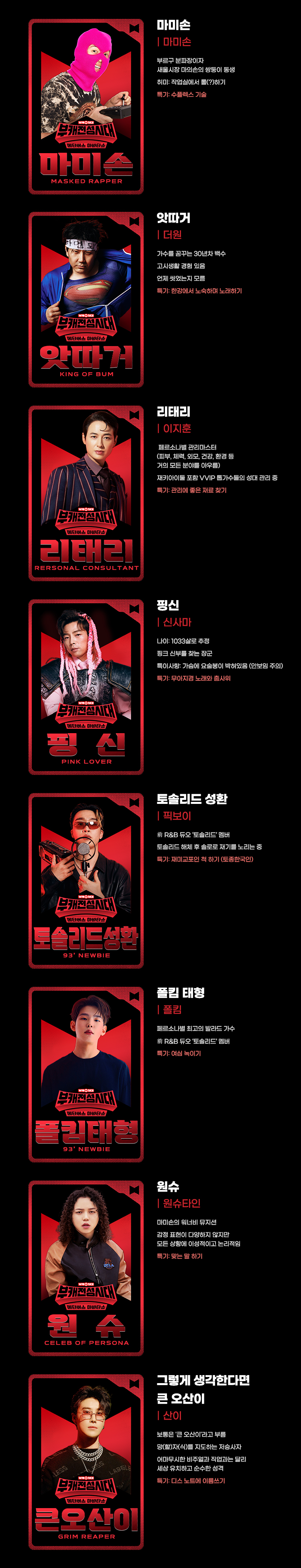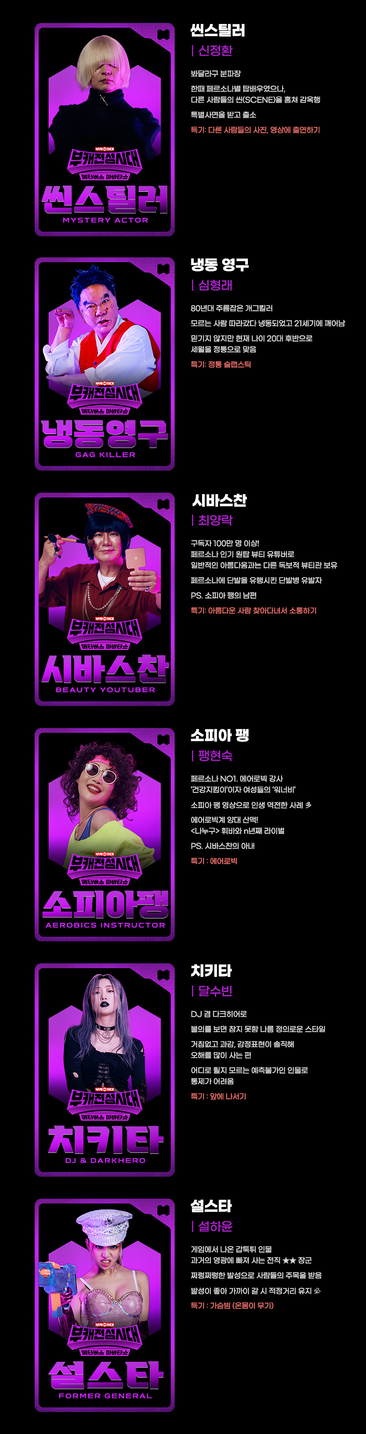 부캐전성시대 출연진 봐달라구 씬스틸러, 냉동 영구, 시바스찬, 소피아 팽, 치키타, 설스타