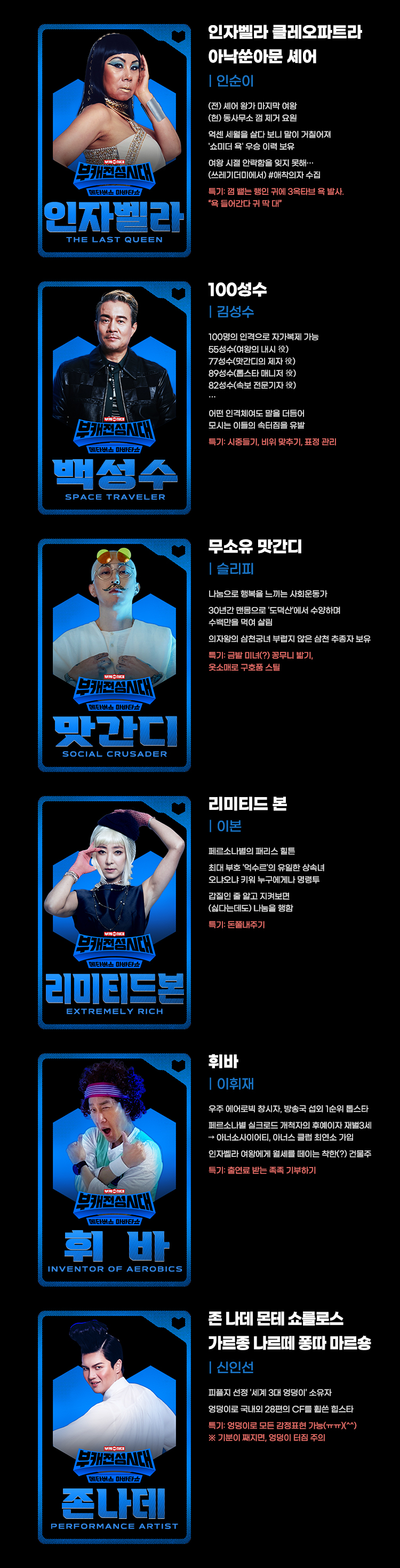 부캐전성시대 출연진 나누구 인자벨라 클레오파트라 아낙쑨아문 셰어, 100성수, 무소유 맛간디, 리미티드 본, 휘바, 존 나데 몬테 쇼를로스 가르종 나르떼 퐁따 마르숑