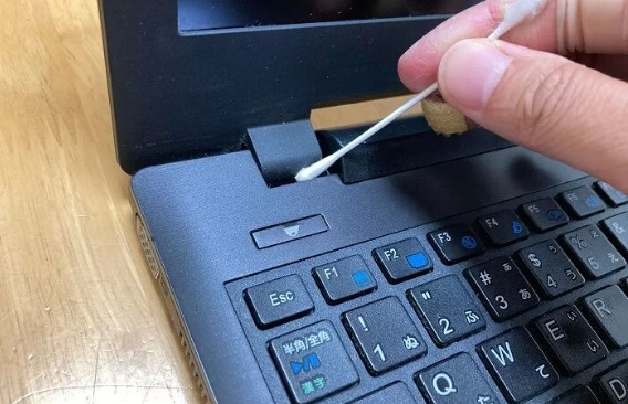 면봉으로 틈새에 묻은 끈적끈적한 때를 닦아냅니다. 노트북의 이음새와 틈새에 먼지와 먼지가 집중되어 있습니다. 면봉에 묻은 세정액으로 작은 틈새를 닦아 내도록 합시다.