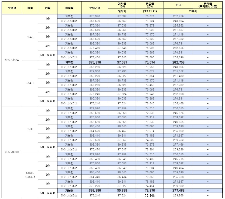 | 주택형 | 타입 | 층별 | 타입별 | 주택가격 | 계약금10% | 중도금20% | 잔금 |
