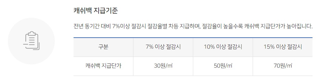 사용량 부피 단위로 해당월의 고지서를 기준으로 계산하는데 예를 들어 7% 이상 절감시 m3당 30원 10% 이상 절감시 m3당 50원 15% 이상 절감시 m3당 70원을 지급한다고 하니 이점도 참고해 주시기 바랍니다.