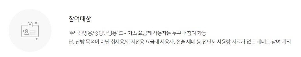 도시가스 절약 캐쉬백 참여 대상을 구체적으로 살펴보면 이렇습니다. 주택난방용, 중앙난방용 도시가스 요금제 사용자는 누구나 참여 가능합니다. 단 난방 목적이 아닌 취사용, 취사전용 요금제 사용자, 전출세대 등 전년도 사용량 자료가 없는 세대는 참여에서 제외가 됩니다.