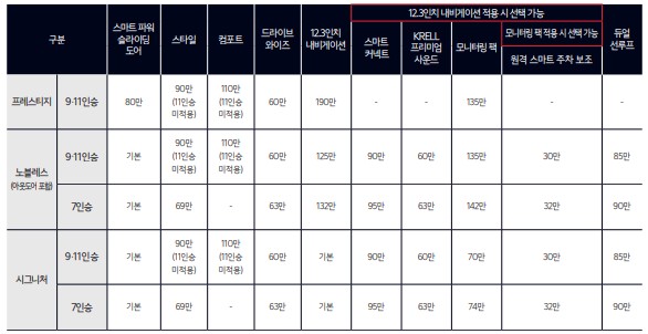 | 컴포트(9인승) | 프레스티지 · 노블레스 | 2열 통풍시트, 2열 파워 리클라이닝 시트(워크인 기능 미적용), 확장형 센터콘솔, 3열 USB 단자(충전용), 가죽시트 |