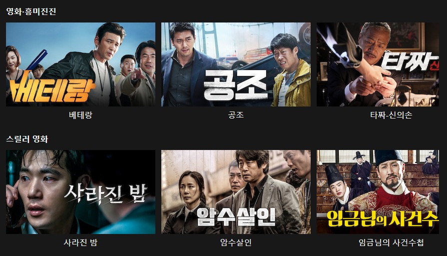 인기영화, 스릴러 영화 - 베테랑, 공조, 타짜 신의 손, 사라진 밤, 암수살인, 임금님의 사건수첩