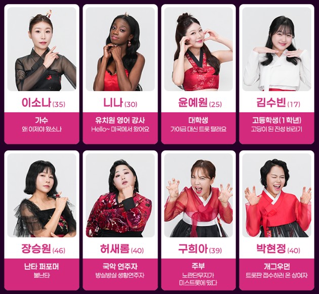 차세대 트로트 여왕은 누구? 거액의 상금이 걸린 우승자의 자리를 두고 치열한 경쟁이 펼쳐진다. 매회 주어지는 미션부터 남녀노소를 사로잡는 화려한 무대까지. 여성 참가자 100명의 화끈한 대