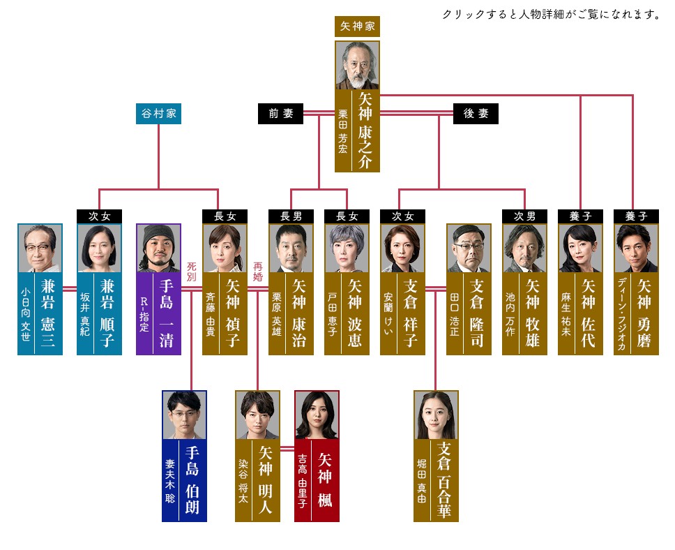 | 手島 伯朗 … 妻夫木 聡 츠마부키 사토시 矢神 楓 … 吉高 由里子 요시타카 유리코 矢神 勇磨 … ディーン・フジオカ 딘 후지오카 矢神 明人 … 染谷 将太 소메타니 쇼타 蔭山 元美 … 中村 アン 나카무라 안 支倉 百合華 … 堀田 真由 홋타 마유 君津 光 … 結木 滉星 유키 코우세이 永峰 杏梨 … 福田麻貴(3時のヒロイン) 手島 一清 … R-指定(Creepy Nuts) |