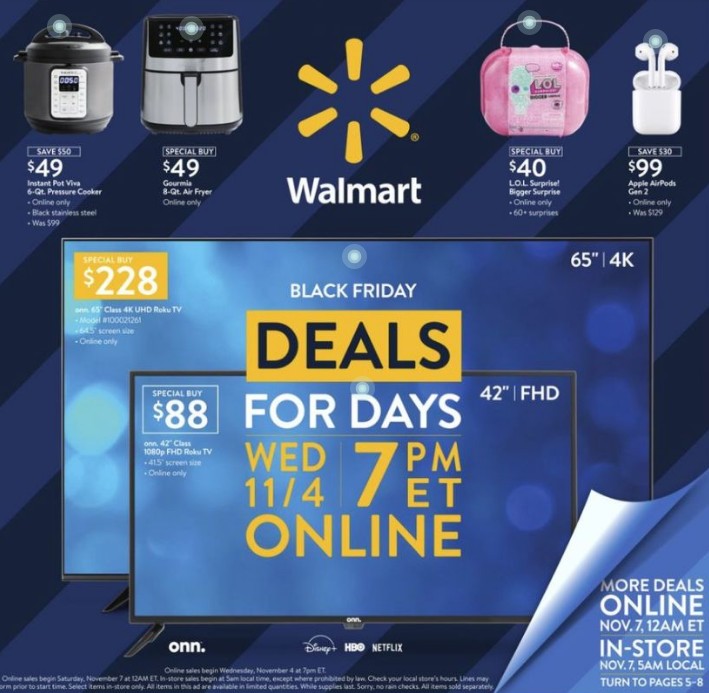 월마트는 2020년 블랙 프라이데이 세일을 위해 온라인 및 매장 내 쇼핑객들을 위한 세 가지 "블랙 프라이데이 데이" 이벤트를 제공합니다. 이 광고는 11월 4일(오후 7시) 온라인에서 첫 번째 판매를 위한 것입니다. 11월 7일(오전 12시) 온라인과 현지 시각으로 오전 5시 매장에서 또 다른 거래가 끊깁니다. 월마트의 두 번째 거래일 행사는 11월 11일부터 시작됩니다.