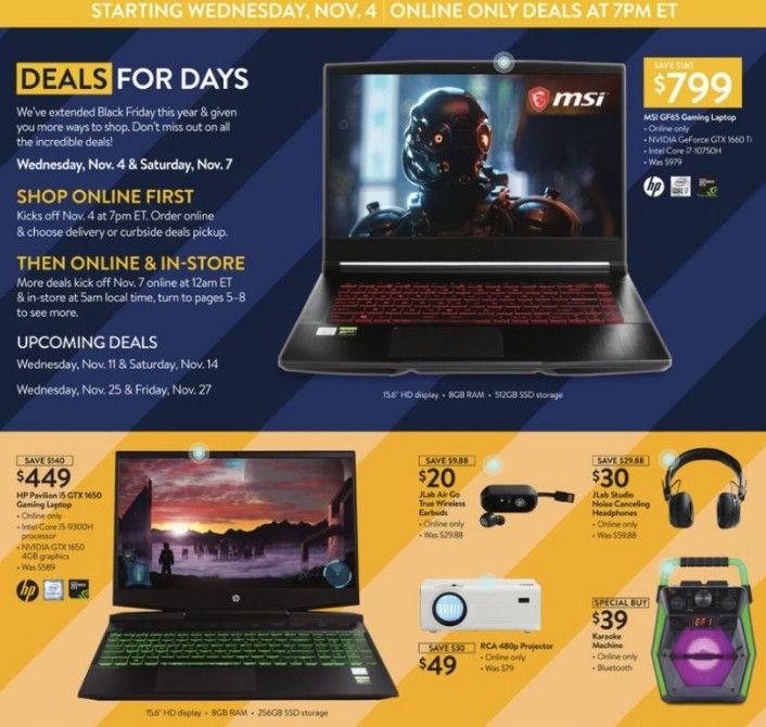 월마트는 2020년 블랙 프라이데이 세일을 위해 온라인 및 매장 내 쇼핑객들을 위한 세 가지 "블랙 프라이데이 데이" 이벤트를 제공합니다. 이 광고는 11월 4일(오후 7시) 온라인에서 첫 번째 판매를 위한 것입니다. 11월 7일(오전 12시) 온라인과 현지 시각으로 오전 5시 매장에서 또 다른 거래가 끊깁니다. 월마트의 두 번째 거래일 행사는 11월 11일부터 시작됩니다.