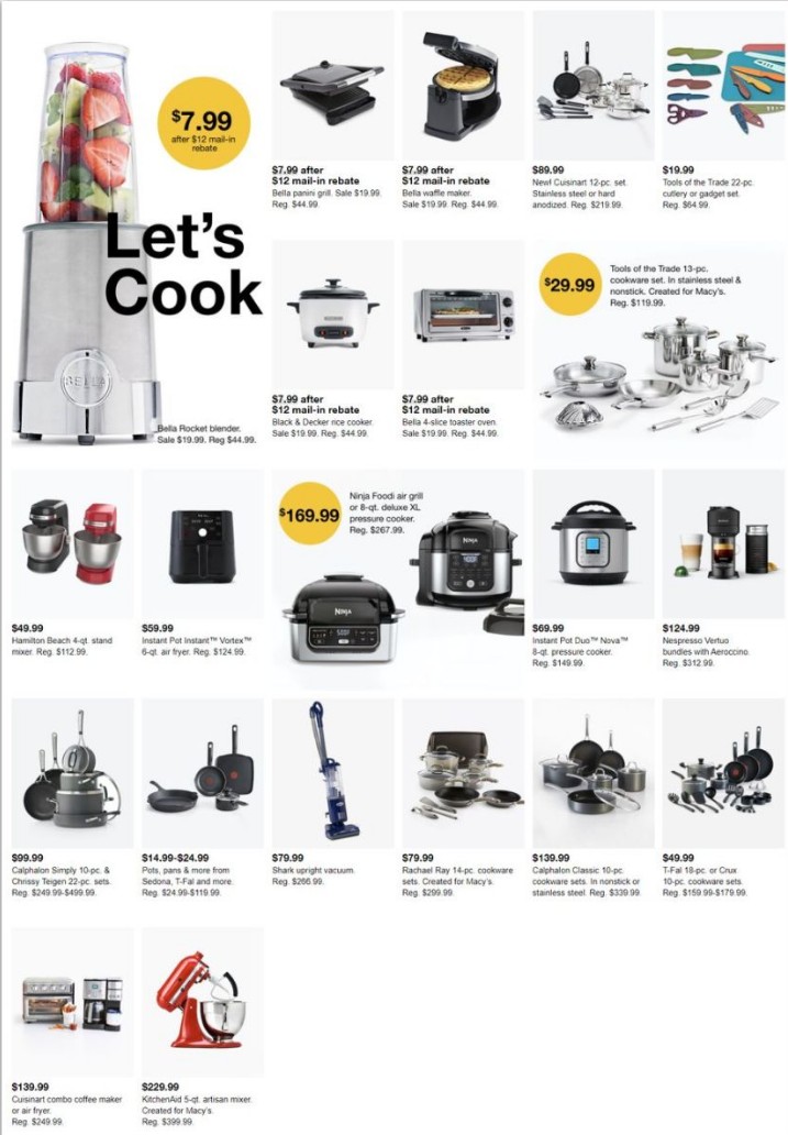 10월 26일에 메이시 블랙 프라이데이 광고를 올렸습니다. 올해, 메이시는 그것의 사이트에 미리보기 페이지로 광고를 시작했습니다. 11월 하순에야 구매가 가능하지만, 미리보기 페이지에서는 쇼핑객들이 원하는 상품을 즐겨찾기에 추가하고 블랙프라이데이 가격이 언제 나올지 알려줍니다. 평상시처럼 메이시의 광고는 의류와 가정용품에 과중하며, 가장 좋은 거래 중 일부는 소형 가전제품에 대한 것입니다.