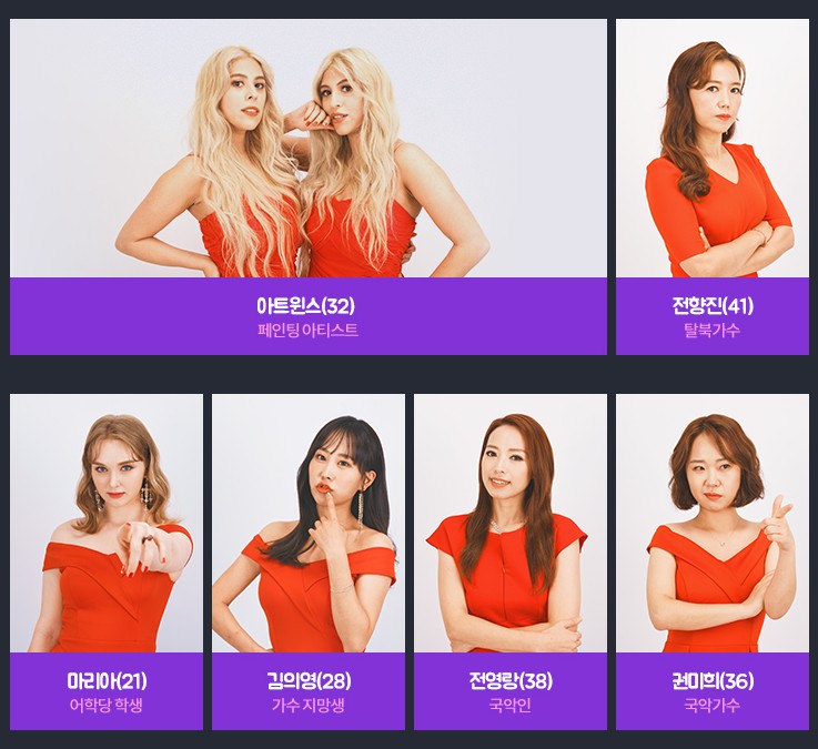 아트윈스(32) 페인팅 아티스트 아르헨티나 도마뱀 자매 | 전향진(41) 탈북가수 함경도 1호 가수 | 마리아(21) 어학당 학생 정통 트로트 부르는 금발 소녀 | 김의영(28) 가수 지망생 캡사이신 보이스의 재림 | 전영랑(38) 국악인 약손 원곡자 | 권미희(36) 국악가수 트롯 K팝 국악의 삼합