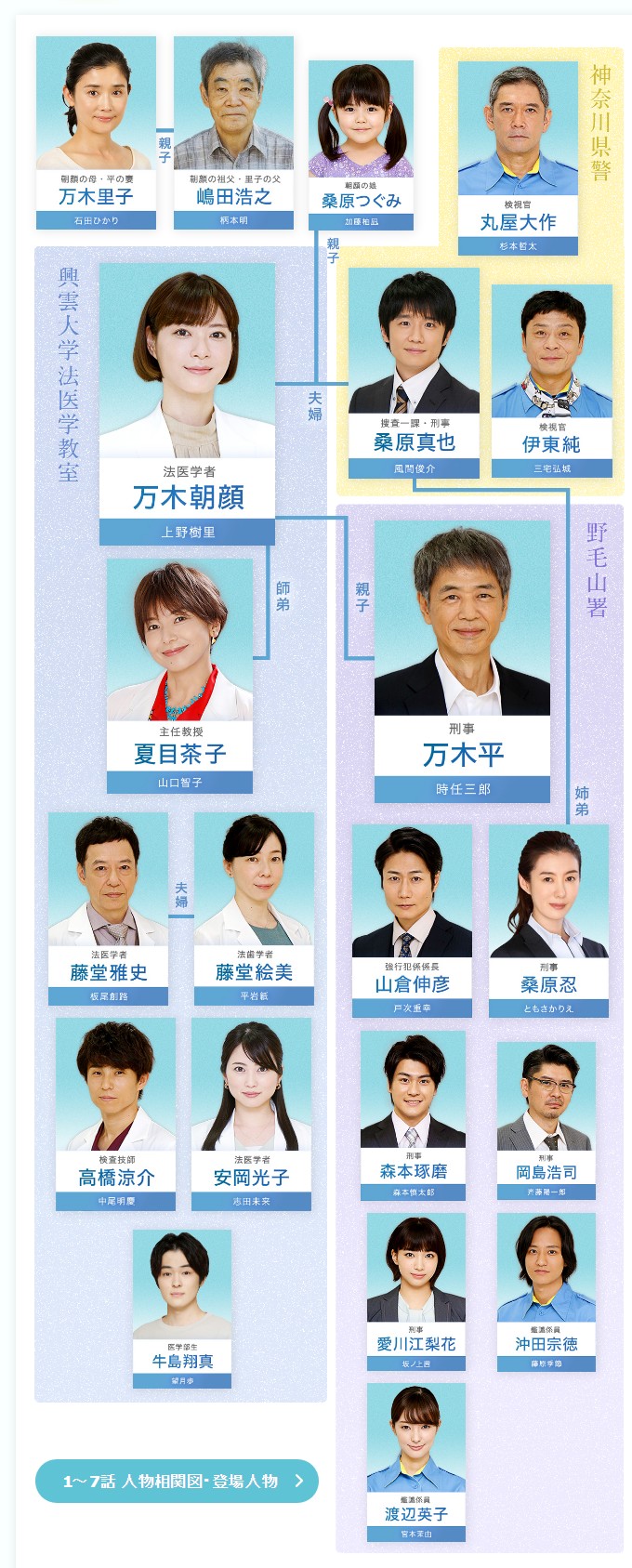 | 万木朝顔 - 上野樹里 우에노 주리 万木平 - 時任三郎 토키토 사부로 桑原真也 - 風間俊介 카자마 슌스케 安岡光子 - 志田未来 시다 미라이 高橋涼介 - 中尾明慶 나카오 아키요시 森本琢磨 - 森本慎太郎(SixTONES) 모리모토 신타로 沖田宗徳 - 藤原季節 후지와라 키세츠 岡島浩司 - 斉藤陽一郎 사이토 요이치로 愛川江梨花 - 坂ノ上茜 사카노우에 아카네 熊田祥太 - 田川隼嗣 牛島翔真 - 望月歩 모치즈키 아유무 渡辺英子 - 宮本茉由 미야모토 마유 |