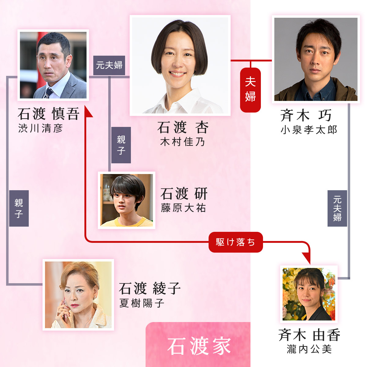 | 石渡杏 - 木村佳乃 기무라 요시노 林優子 - 吉田羊 요시다 요 蒲原まり - 仲里依紗 나카 리이사 斉木巧 - 小泉孝太郎 고이즈미 고타로 赤坂剛 - 磯村勇斗 이소무라 하야토 山下のり子 - 森田望智 모리타 미사토 斉木由香 - 瀧内公美 타키우치 쿠미 林大介 - 奥平大兼 오쿠다이라 다이켄 蒲原繁秋 - 宮世琉弥 미야세 류비 石渡研 - 藤原大祐 후지와라 타이유 |