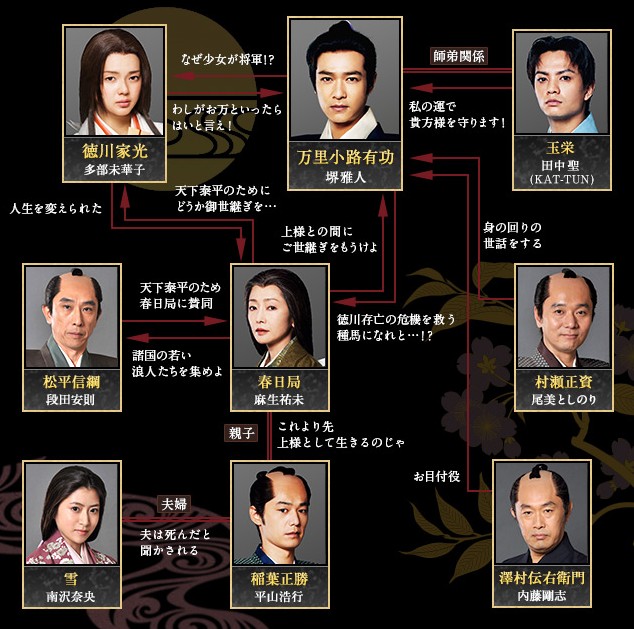 | 万里小路有功:堺雅人 사카이 마사토 徳川家光 (とくがわいえみつ):多部未華子 타베 미카코 玉栄 (ぎょくえい):田中聖 (KAT-TUN) 다나카 코키 稲葉正勝 (いなばまさかつ):平山浩行 히라야마 히로유키 雪 (ゆき):南沢奈央 미나미사와 나오 村瀬正資 (むらせまさすけ):尾美としのり 오미 토시노리 松平信綱 (まつだいらのぶつな):段田安則 단타 야스노리 澤村伝右衛門 (さわむらでんえもん):内藤剛志 나이토 타카시 春日局 (かすがのつぼね):麻生祐未 아소우 유미 |