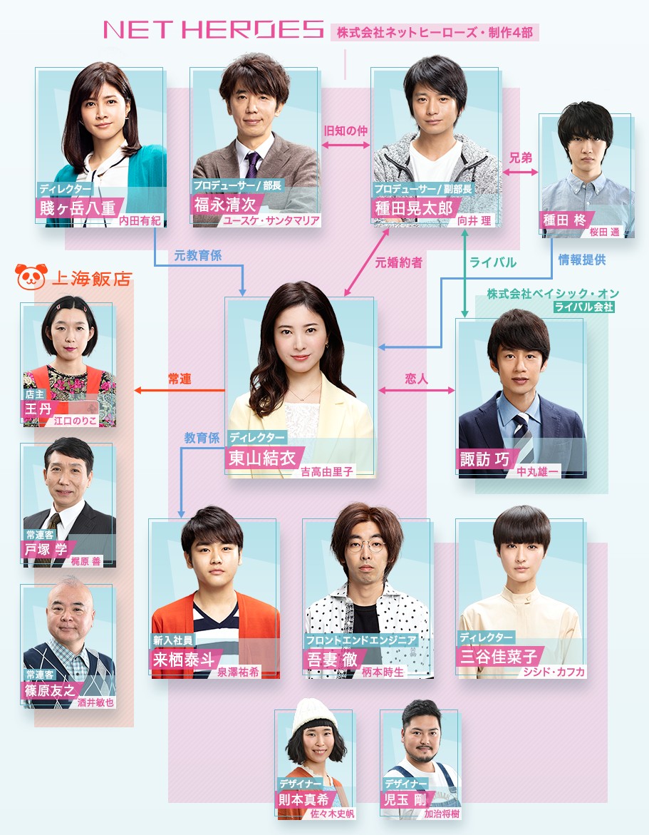 | 요시타카 유리코 吉高由里子 ... 東山結衣 役 WEB 제작사 넷히어로즈에 근무하며 WEB 디렉터로 일하고 있습니다. 절대 야근하지 않는다는 모토로 입사 이후 정시에 퇴근하는 생활을 계속하고 있습니다. 일중독으로 집에 돌아가지 않는 아버지를 보고 자랐기 때문에, 일에 목숨을 건다는 삶의 방식을 철저히 부정하고 있습니다. 정시 퇴근 후에는 단골가게 상하이반점의 해피아워에서 맥주를 마시는 것이 일과입니다. 일은 효율을 중시해, 타인에게 폐를 끼치지 않는 일하는 방식을 목표로 하고 있습니다. 무카이 오사무 向井理 ... 種田晃太郎 役 제작 4부의 부부장으로 WEB 프로듀서입니다. 結衣의 전 약혼자입니다. 후쿠나가가 사장을 맡는 회사에 근무하고 있었을 무렵, 유이와 만나, 결혼의 약속을 하고 있었지만, 일 우선의 자세로부터 엇갈림이 계속 되어, 약혼이 파담. 그 후, 헤드헌팅에 의해 넷 히어로즈로 전직했습니다. 일에 너무 집중하면 주위가 보이지 않게 되는 워커 홀릭 체질입니다. 회사 내에서도 제일가는 인기남입니다.후배의 팔로우는 빼놓지 않고 팀원들로부터의 신뢰도 두텁습니다. 나카마루 유이치 中丸雄一 ... 諏訪巧 役 유이의 애인이에요. 넷히어로즈의 라이벌 회사이자 업계 최대기업인 베이식온에서 근무하고 있습니다. 가정적인 남성으로 結衣에 있어서 이상적인 상대입니다. 아웃도어가 취미이며, 요리를 하거나 멀리 나가거나, 일보다 개인적인 시간을 중요하게 여기고 있습니다. 한편으로는 영업사원으로서도 우수하고 후배들로부터도 사랑을 받고 있습니다. 에모토 토키오 柄本時生 ... 吾妻徹 役 結衣의 동료입니다 프론트엔드 엔지니어입니다중도 채용입니다. 기술은 있지만 어쨌든 요령부린 일처리 때문에 일이 늦어서 끝나지 않아요. 집에 돌아가도 특별히 할 일이 없다거나 한 사람이 작업이 진행된다는 등의 이유를 대면서 회사에 정착하고 있습니다. 이즈미사와 유키 泉澤祐希 ... 来栖泰斗 役 유이가 교육계로서 돌보고 있는 신인입니다. WEB 디렉터 수습입니다. 의욕 제로이고, 두 번째 말로는 「그만두고 싶다」라고 말합니다.하지만, 일의 줄거리는 나쁘지 않습니다. 주위가 좋아하고 일에 몸을 바치는 가운데, 잔업하지 않는 주의의 결의의 유일한 편이기도 합니다. 이래저래 유이를 그리워하고 있습니다. 시시도 카후카 シシド・カフカ ... 三谷佳菜子 役 結衣의 동료입니다. WEB 디렉터입니다.전직조입니다. 초등학교 때부터 하루도 학교를 쉰 적이 없고 회사도 입사 이래 받는 개근상입니다. 너무 성실하고 노력하는 성격이지만 좀 융통성이 없어요.어려운 직장 환경에서 자라왔기 때문에 요즘 신인들의 느슨함이 용서할 수 없습니다.동갑내기 結衣가 차이가 나지 않으려고 초조해 하고 있습니다. 에구치 노리코 江口のりこ ... 王丹 役 結衣가 회사를 정시에 마친 후에 직행하는 중화요리 「상하이반점」의 점주예요. 항상, 일본인의 과중 노동에는 의문을 품고 있습니다. 18시 오픈으로 18시 10분까지 해피 아워. 손님이 없으면 20시에 문을 닫는 등 무리하게 일하지 않는 주의입니다. |