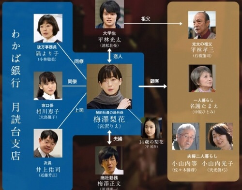 | 梅澤梨花 우메자와 리카 역 ... 原田知世 하라다 토모요 남편의 아무렇지도 않은 언행에 상처를 받아온 주부입니다.은행 파트에 나간 뒤에야 겨우 자리를 찾았다고 생각했지만 오히려 부부의 골은 깊어지고 맙니다.그런 때에 만난 코타로부터 「당신은 멋집니다」라는 말을 들은 것에 의해 이화는 크게 변해간다. 岡崎木綿子 오카자키 유코 역 ... 水野真紀 미즈노 마키 이화의 고등학교 친구입니다.돈으로는 행복할 수 없다고 비정상적으로 검약에 노력하지만, 그 때문에 남편이나 딸과의 관계가 삐걱거리기 시작하고 있습니다. 中条亜紀 츄죠 유키 역 ... 西田尚美 니시다 나오미 이화의 고등학교 친구. 쇼핑의존증으로 인해 이혼하였고, 외동딸의 친권을 상실합니다.오랜만에 재회한 딸과도 쇼핑을 통해서 밖에 관계를 구축할 수 없습니다. 平林光太 히라바야시 코타 역 ... 満島真之介 미츠시마 신노스케 히라바야시 타카시조의 손자로, 조부의 집에서 만난 이화의 꾸밈없는 성격에 한눈에 반하게 됩니다.학생이면서 자주 영화에 빠져, 고액의 빚을 떠안고 있습니다. 平林孝三 히라바야시 코조 역 ... ミッキー・カーチス 미키 커티스 만석꾼으로 와카바는 은행의 단골손님입니다.아들·손자 손녀에게는 일절 돈을 주지 않는 괴팍한 성격이지만 이화 때문에 마음에 쏙 들어 거금을 맡기고 갑니다. 名護たま江 나고 타마에 역 ... 冨士眞奈美 후지 마나미 이화의 고객으로 이화를 깊이 신뢰하고 있습니다.친딸이 자신의 돈을 노리고 있다는 피해망상을 안고 있지만, 실은 그것은 바보의 전조였습니다. 梅澤正文 우메자와 마사후미 ... 光石研 미츠이시 켄 이화의 남편. 기업인이었던 이화 집에 콤플렉스가 있어 아내를 부양하겠다는 패기가 역력해지면서 아내를 상처입히는 행동을 하게 됩니다. |