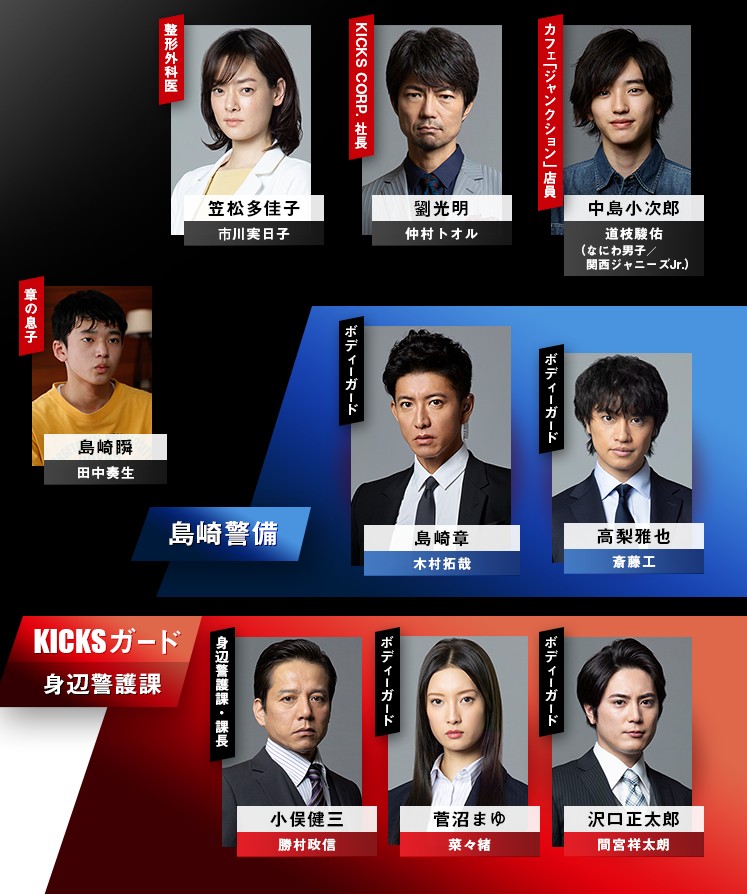 | 시마자키 아키라 역 島崎章 - 木村拓哉 기무라 타쿠야 탁월한 스킬을 가진 보디가드입니다.경호 실수로 축구선수 고노 준야로부터 선수 생명을 빼앗아 버려, 오랫동안 신변 경호 업무에서 물러났지만, 「히노데 경비 보장」의 신변 경호과로 이동되어 복귀했습니다. 타카나시 마사야 역 高梨雅也 - 斎藤工 사이토 타쿠미 전 자위대원의 보디가드입니다.히노데 경비 보장에 이어 KICKS가드 신변 경호과에서도 장과 함께 일하고 있었습니다. 스가누마 마유 역 菅沼まゆ - 菜々緒 나나오 'KICKS가드' 신변경호과 경호원입니다.「히노데 경비 보장」에서도 장과 함께 일하고 있었습니다.이전에는 장래가 유망시되는 유도선수로 활약해, 운동신경이 발군입니다. 사와구치 쇼타로 역 沢口正太郎 - 間宮祥太朗 마미야 쇼타로 'KICKS가드' 신변경호과 경호원입니다.「히노데 경비 보장」에서도 장과 함께 일하고 있었습니다.사물을 그다지 깊게 생각하지 않고, 이해가 가볍습니다. 나카지마 코지로 역 中島小次郎 - 道枝駿佑 미치에다 슌스케 사설 경호원이 된 장이 사무실을 차린 상가 1층에 있는 카페 분기점에서 아르바이트를 하고 있는 대학생입니다.대학에서 정보공학을 전공하고 있습니다. 시마자키 슌 역 島崎瞬 - 田中奏生 다나카 카나오 아키라의 아들. 중학교 3학년, 고교 수험을 맞이하고 있습니다.여전히 사춘기이고 아버지와의 사이에는 약간의 거리가 있습니다. 카사마츠 타카코 역 笠松多佳子 - 市川実日子 이치카와 미카코 국리회백산종합병원 정형외과 의사입니다.히노데 경비보장'이 'KICKS CORP.(키스코퍼레이션)'에 인수되기 전부터 계속 신변경호과 계약 담당의를 하고 있습니다.신체관리뿐 아니라 경호원의 푸념도 듣는 장들에게 힐링이 될 수 있어요. |