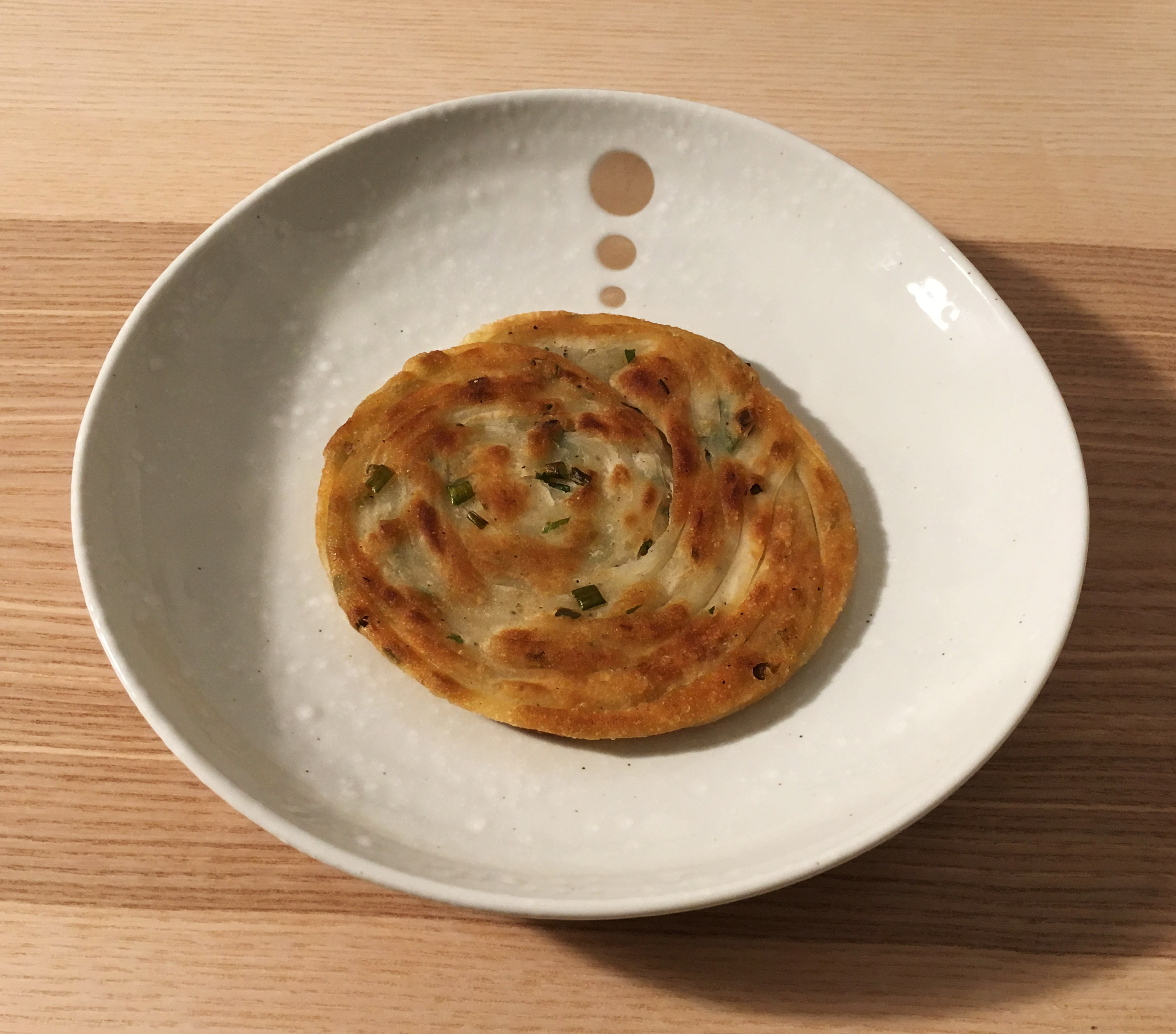 한국의 파전과 달리, 얇게 민 반죽에 송송 썬 파를 뿌리고 겹겹이 포개어 다시 밀대로 민 뒤 지져낸 음식입니다.