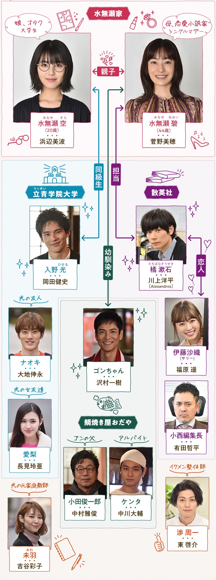 | 칸노 미호 菅野美穂 / 水無瀬碧 役 하마베 미나미 浜辺美波 / 水無瀬空 役 오카다 켄시 岡田健史 / 入野光 役 카와카미 요헤이 川上洋平 [Alexandros] / 橘漱石 役 아리타 텟페이 有田哲平 / 小西編集長 役 사와무라 잇키 沢村一樹 / ゴンちゃん 役 후쿠하라 하루카 福原遥 / 伊藤沙織(サリー) 役 |