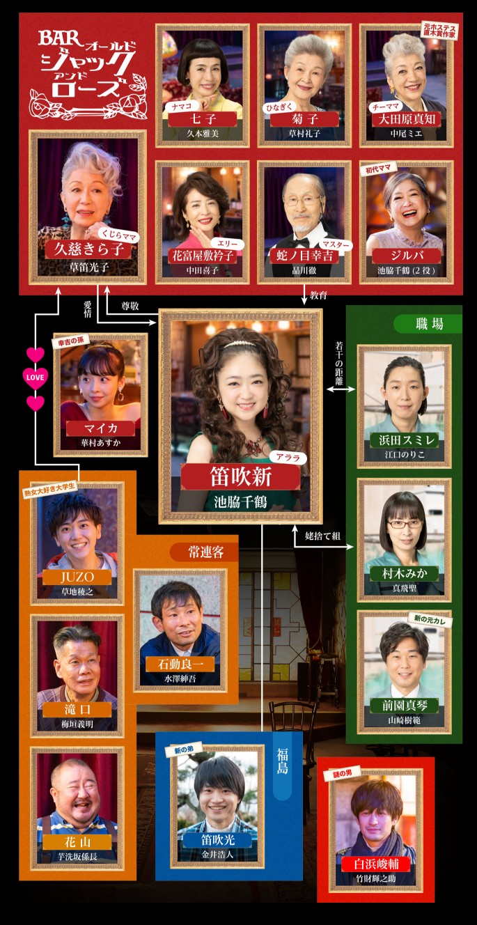 | 笛吹新 | 池脇千鶴 이케와키 치즈루 浜田スミレ | 江口のりこ 에구치 노리코 村木みか | 真飛聖 마토부 세이 前園真琴 | 山崎樹範 야마자키 시게노리 大田原真知(チーママ) | 中尾ミエ 나카오 미에 七子(ナマコ) | 久本雅美 히사모토 마사미 菊子(ひなぎく) | 草村礼子 쿠사무라 레이코 花富屋敷衿子(エリー) | 中田喜子 나카다 요시코 蛇ノ目幸吉(マスター) | 品川徹 시나가와 토오루 久慈きら子(くじらママ) | 草笛光子 쿠사부에 미츠코 |