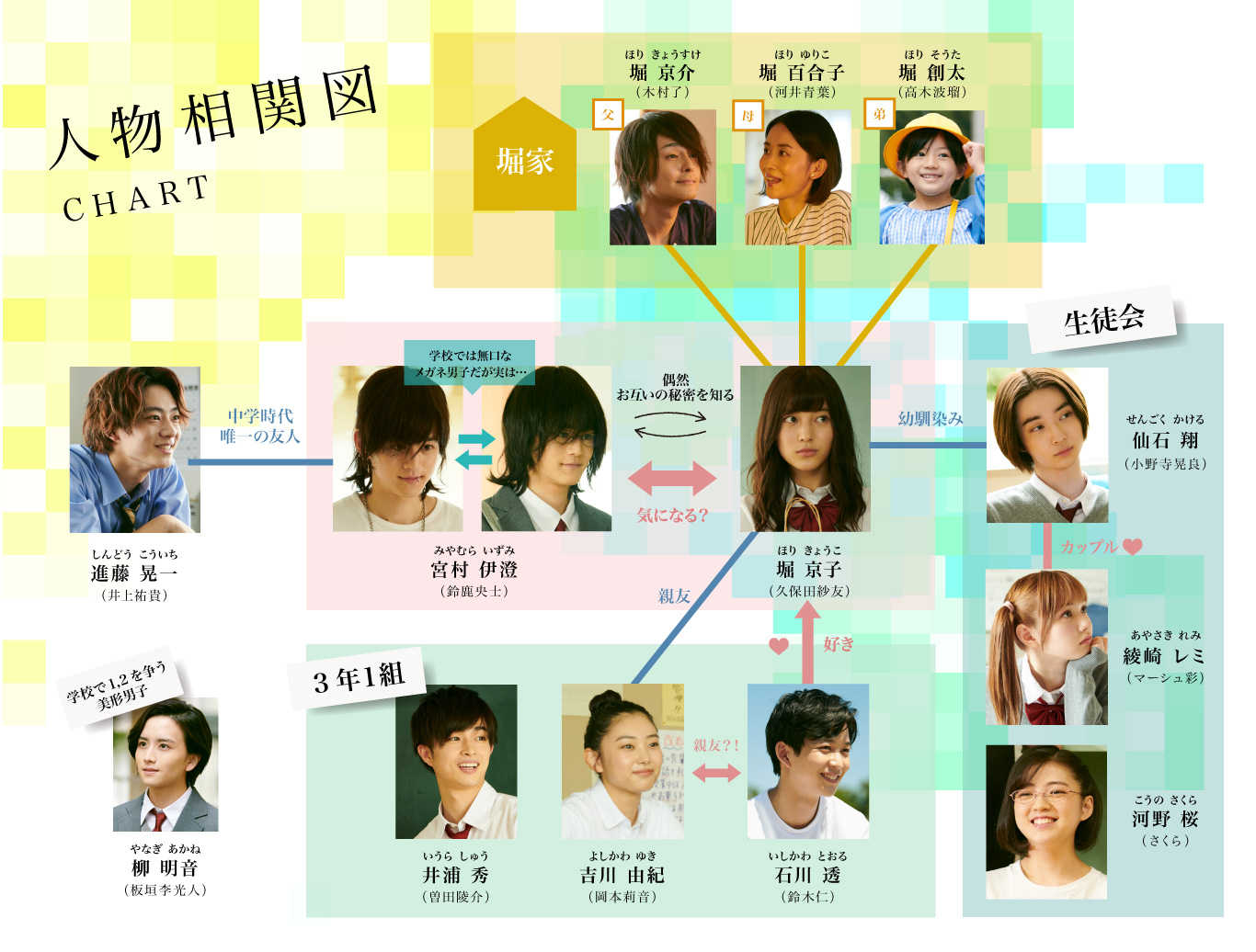 | 宮村 伊澄 役 - 스즈카 오우지 鈴鹿央士 Oji Suzuka 堀 京子 役 - 쿠보타 사유 久保田紗友 Sayu Kubota 石川 透 役 - 스즈키 진 鈴木仁 Jin Suzuki 吉川由紀 役 - 오카모토 리온 岡本莉音 Rion Okamoto 仙石 翔 役 - 오노데라 아키라 小野寺晃良 Akira Onodera 綾崎レミ 役 - 아야 마쉬 マーシュ彩 Aya Marsh 河野 桜 役 - 사쿠라 さくら Sakura 井浦秀 役 - 소다 료스케 曽田陵介 Ryosuke Sota 進藤晃一 役 - 이노우에 유키 井上祐貴 Yuki Inone 柳明音 役 - 이타가키 리히토 板垣李光人 Rihito Itagaki 堀百合子 役 - 카와이 아오바 河井青葉 Aoba Kawai 堀京介 役 - 키무라 료 木村了 Ryo Kimura |